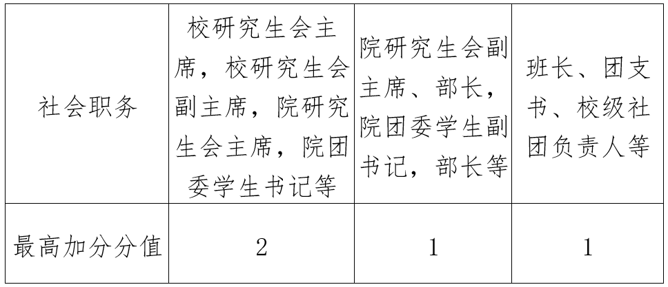 研究生社会活动加分可累加,但加分上限不得超过10分。研究生干部加分由主管领导及辅导员考核加分,加分分值=职位最高加分分值*考核百分比(≤1)。党支部负责人参考院学生工作办公室出具的考核情况表,加分分值=职位最高加分分值*考核百分比(≤1)。其他社会活动加分原则将在具体活动发布通知时公布。